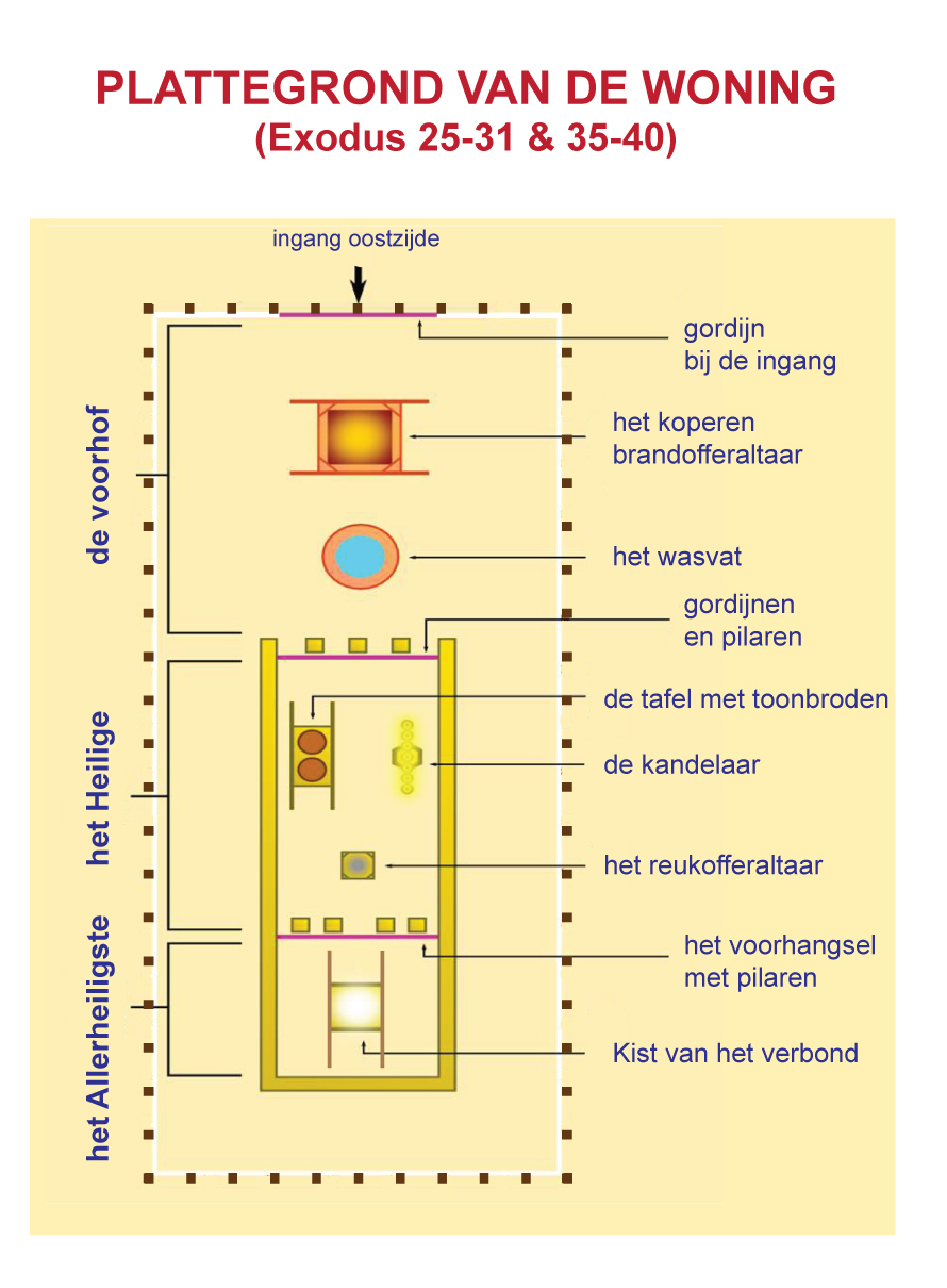 1 “Je zult het altaar van acaciahout maken met een lengte van vijf el en een breedte van vijf el. Het altaar zal vierkant zijn en de hoogte ervan drie el. ◻ ◘ 2 Op de vier hoeken zul je de horens ervan maken. De horens ervan zullen er één geheel mee vormen en je zult het met koper overtrekken. ◻ 3 Je zult de potten erbij maken voor de verbrande vetresten ervan, en ook zijn scheppen, zijn sprenkelkommen, zijn vorken en zijn vuurschalen. Alle bijbehorende voorwerpen zul je van koper maken. 4 Je zult er een raster voor maken, een koperen vlechtwerk, en aan dat vlechtwerk zul je vier koperen ringen maken, aan de vier hoekpunten ervan. ◻ 5 Je zult het onder de opstaande rand van het altaar bevestigen, aan de onderkant, zodat het vlechtwerk halverwege het altaar komt te hangen. ◻ 6 Je zult draagstokken voor het altaar maken, draagstokken van acaciahout, en je zult ze met koper overtrekken. ◻ 7 De draagstokken ervan zullen door de ringen worden gestoken. De draagstokken moeten aan beide zijden van het altaar zitten als het wordt gedragen. 8 Als een holle ruimte van planken zul je het maken. Zoals Hij het je op de berg heeft laten zien, zo moeten zij het maken. ◻ 9 Je zult de voorhof van de Woning maken. Aan de zuidzijde, op het zuiden, moeten er zeildoeken voor de voorhof hangen van getwijnd fijn linnen met een lengte van honderd el voor één zijde. ◘ 10 De twintig zuilen en de twintig voetstukken ervan zullen van koper zijn. De haken van de zuilen en hun verbindingsstaven zullen van zilver zijn. ◻ 11 Zo zullen er ook aan de noordzijde, in de lengte, zeildoeken zijn met een lengte van honderd el. De twintig zuilen en de twintig voetstukken ervan zullen van koper zijn. De haken van de zuilen en hun verbindingsstaven zullen van zilver zijn. 12 In de breedte van de voorhof, aan de westzijde, moeten zeildoeken komen met een lengte van vijftig el, met de tien bijbehorende zuilen en de tien bijbehorende voetstukken. 13 De breedte van de voorhof aan de oostzijde, aan de kant van de zonsopgang, zal vijftig el zijn. 14 De zeildoeken aan de ene zijde van voren zullen vijftien el lang zijn. Daarbij horen drie zuilen en drie voetstukken. ◻ 15 Voor de andere zijde van voren ook zeildoeken van vijftien el met hun drie zuilen en hun drie voetstukken. ◻ 16 Vóór de poort van de voorhof zal een gordijn komen met een lengte van twintig el, van purperblauw, purperrood en scharlakenrood garen en van getwijnd fijn linnen, gemaakt als een borduurwerk, met de vier bijbehorende zuilen en de vier voetstukken ervan. ◻ 17 Alle zuilen rondom de voorhof zullen zilveren verbindingsstangen hebben, en de haken ervan zullen van zilver zijn en hun voetstukken van koper. 18 De lengte van de voorhof zal honderd el zijn, de breedte vijftig en nog eens vijftig el en de hoogte vijf el, alles van getwijnd fijn linnen. De bijbehorende voetstukken zullen van koper zijn. ◻