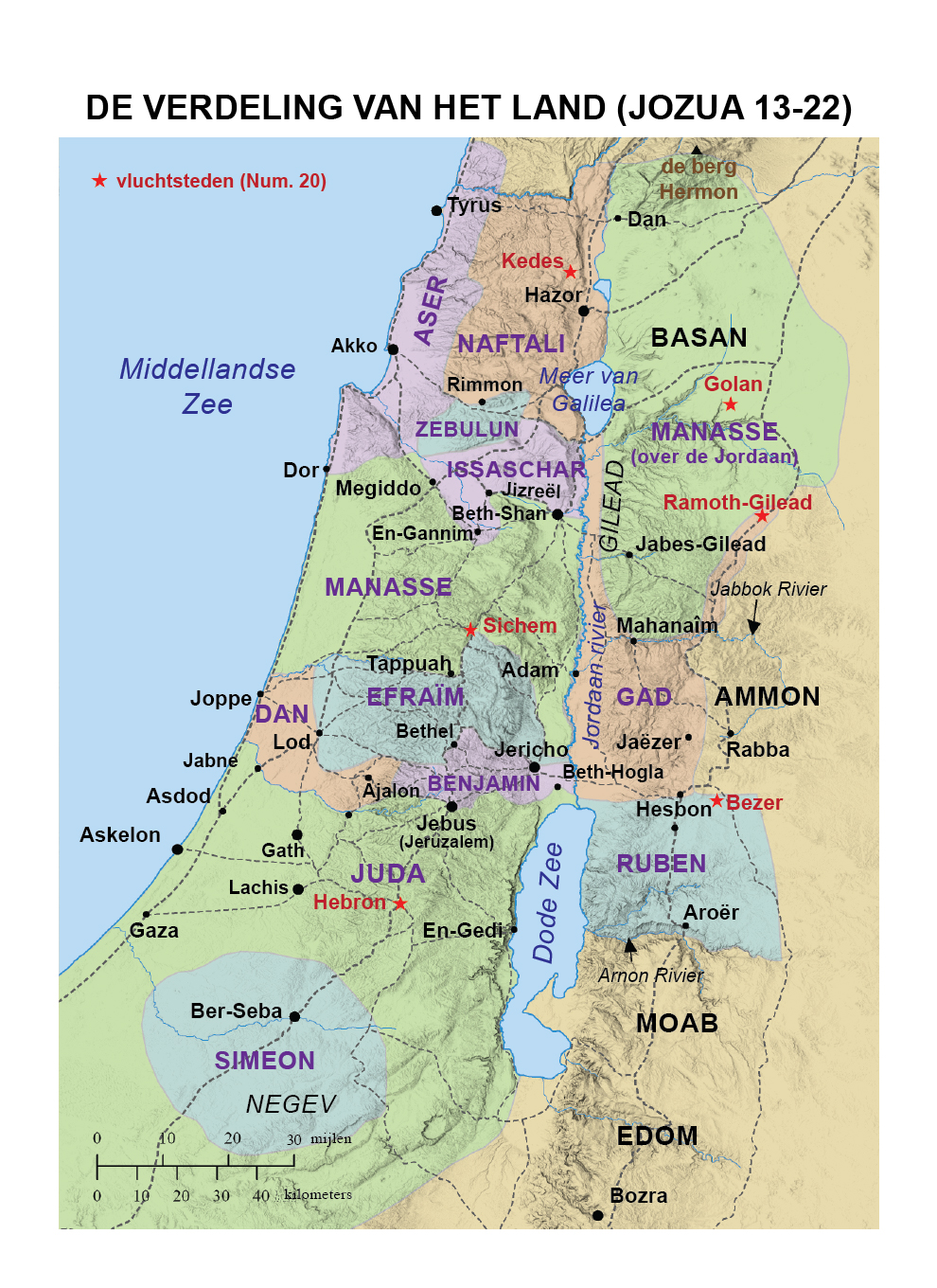 1 Jozua was oud en bejaard geworden, en de HEERE zei tegen hem: “Je bent oud en bejaard geworden, en er is nog heel veel land overgebleven om het als erfdeel in bezit te nemen. ◻ 2 Dit is het land dat overgebleven is: alle landstreken van de Filistijnen en alle gebieden van de Gesurieten, ◻ 3 vanaf de rivier de Sichor die tegen Egypte aan ligt, tot aan de grens van Ekron in het noorden, dat tot het gebied van de Kanaänieten wordt gerekend, met daarin vijf stadsvorsten van de Filistijnen, namelijk van de Gazatieten, van de Asdodieten, van de Askelonieten, van de Githieten, van de Ekronieten, en van de Avvieten, ◻ 4 en verder vanaf het zuiden heel het land van de Kanaänieten, en ook Meara dat van de Sidoniërs is, tot aan Afek toe, tot aan de grens van de Amorieten, ◻ 5 en verder het land van de Giblieten en heel de Libanon, vanaf het oosten, vanaf Baäl-Gad onder aan de berg Hermon tot waar je bij Hamat komt, ◻ 6 alle bewoners van het gebergte vanaf de Libanon tot aan Misrefot-Majim toe, alle Sidoniërs. Ik zal hen allen voor de ogen van de zonen van Israël verdrijven. Alleen moet je ervoor zorgen dat het land door het lot aan Israël als erfdeel toevalt, zoals Ik je geboden heb.” ◻ Het erfdeel van Ruben, Gad en de halve stam Manasse