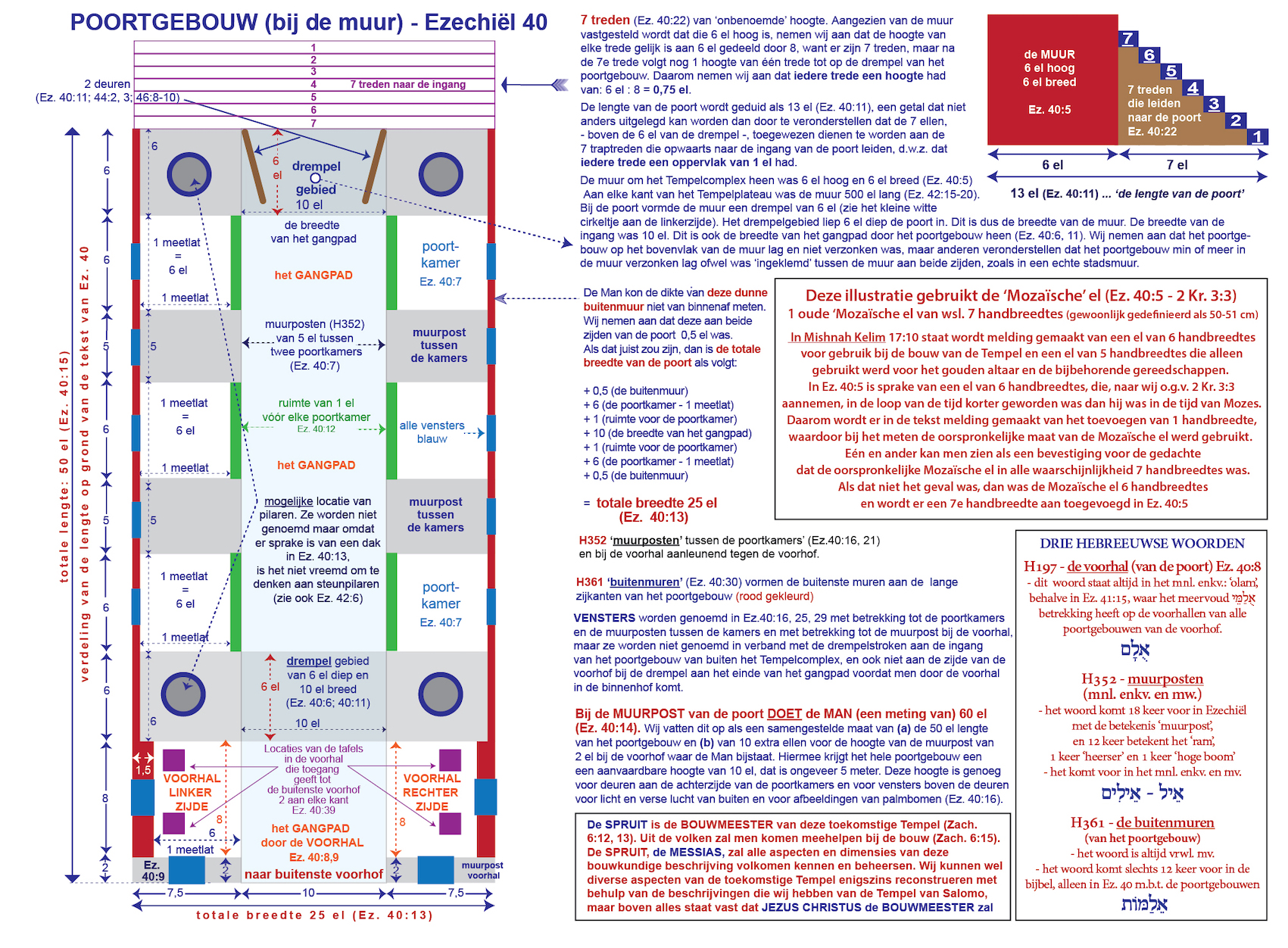 6 Vervolgens kwam hij bij het poortgebouw gericht op het oosten en hij liep de trappen ervan op en mat de drempel van de poort: één lat breed, en de andere drempel was ook één lat breed. ◼ ◻ 7 Een poortkamer was één lat lang en één lat breed. Tussen de poortkamers in zat vijf el en de drempel van het poortgebouw, aan de kant van de voorhal van het poortgebouw aan de kant van het Huis, was één lat. ◼ 8 Hij mat de voorhal van het poortgebouw aan de binnenzijde: één lat. ◼ 9 Hij mat de voorhal van het poortgebouw, acht el, en de muurposten ervan waren twee el. De voorhal van het poortgebouw lag aan de kant van het Huis. ◼ 10 Van de poortkamers van het poortgebouw aan de oostzijde waren er drie aan de ene kant en drie aan de andere kant. Ze hadden alle drie éénzelfde maat. De muurposten hadden ook éénzelfde maat aan de ene kant en aan de andere kant. 11 Hij mat de breedte van de ingang van het poortgebouw, tien el, en de lengte van de poort, dertien el. ◼ 12 De afscheiding vóór de poortkamers was één el aan de ene kant en één el was de afscheiding aan de andere kant. Eén poortkamer was zes el aan de ene kant en zes el aan de andere kant. ◼ ◻ 13 Ook mat hij het poortgebouw vanaf het dak van de ene poortkamer tot aan het dak van de andere. De breedte was vijfentwintig el, ingang tegenover ingang. ◼ ◻ 14 Hij deed ook een meting bij de muurposten: zestig el, en de voorhof lag tegen de muurpost aan, helemaal om het poortgebouw heen. ◼ ◻ 15 Van de voorzijde van de toegangspoort tot aan de voorkant van de voorhal van de binnenpoort was vijftig el. ◼ ◻ 16 Er waren afgesloten vensters bij de poortkamers en bij de muurposten ervan aan de binnenzijde van het poortgebouw in het rond, en zo ook aan de buitenmuren. De vensters rondom waren naar binnen gericht en op de muurpost waren palmbomen. ◼ ◻