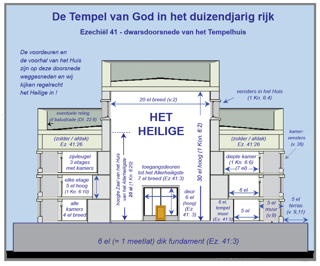 5 Hij mat de muur van het Huis, zes el, en de breedte van de zijvleugel was vier el rondom heel het Huis. ◼ ◻ 6 De zijkamers lagen zijkamer aan zijkamer, drie hoog, dertig keer een zijkamer. Zij kwamen uit op de muur van het Huis die diende voor de zijkamers daar helemaal omheen om er een houvast voor te bieden. Zij mochten geen inbreuk maken op de muur van het Huis zelf. ◼ ◻ 7 Rondom naar boven toe kwam er per verdieping meer ruimte bij de zijkamers, want de omloop van het huis liep per verdieping helemaal om het Huis heen. Daarom kreeg het Huis naar boven toe meer ruimte en zo kon men vanaf de onderste verdieping via de middelste verdieping omhoog naar de bovenste verdieping. ◻