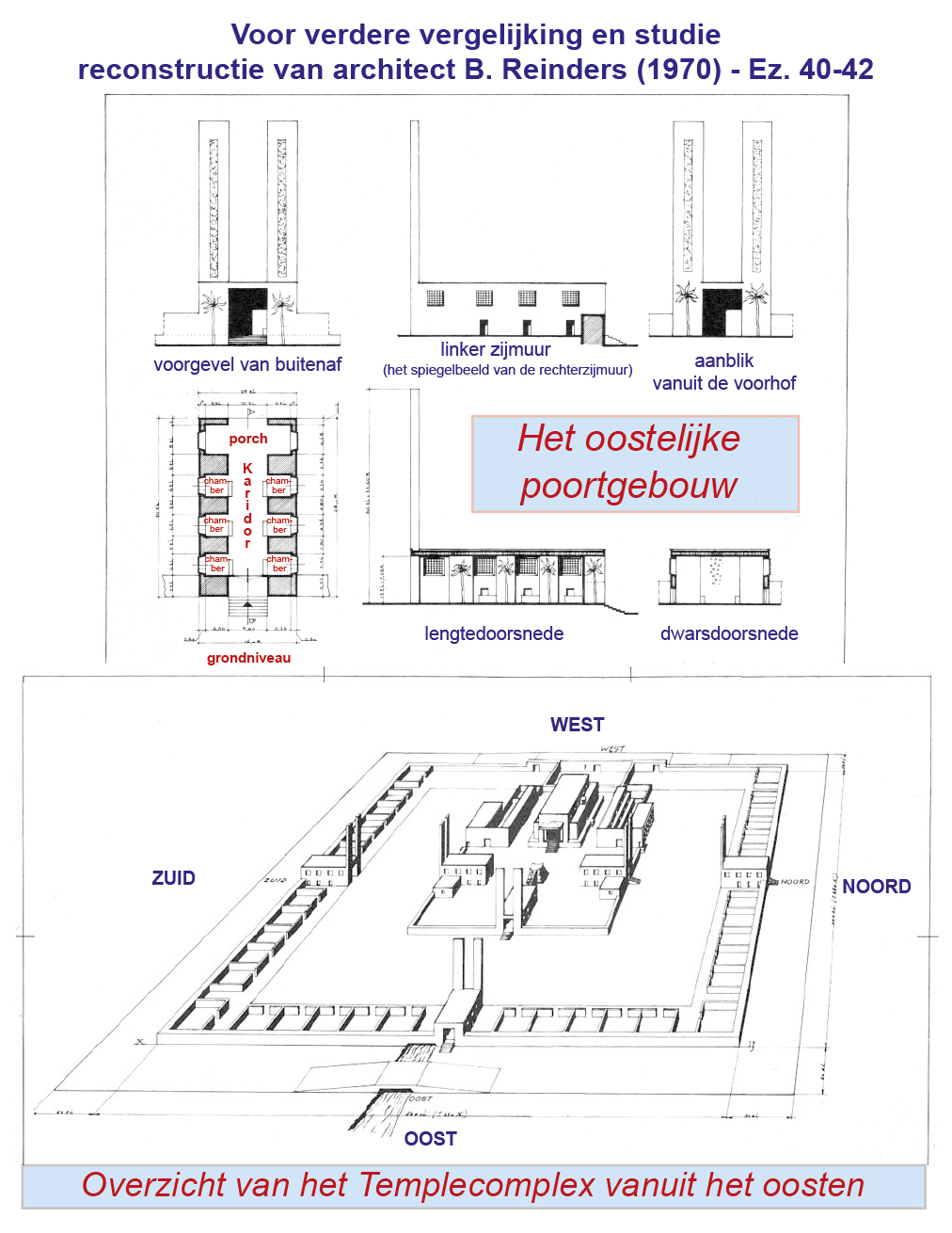 De binnenkant van de Tempel, de voorhallen aan de voorhof, ◼ 16 de drempels, de afgesloten vensters en de galerijen rondom op alledrie de verdiepingen tegenover de drempel, dat alles was helemaal rondom met houten panelen bedekt, vanaf de grond tot op de vensters, en de vensters zelf waren bedekt. ◻ 17 Op het vlak boven de ingang tot aan het binnenste van het Huis, en aan de buitenkant van het Huis, tegen heel de muur eromheen, vanbinnen en vanbuiten, waren er houten panelen. ◻ 18 Er waren cherubs en palmbomen op aangebracht. Er stond steeds een palmboom tussen de ene cherub en de andere cherub in en elke cherub had twee gezichten: ◼ 19 het gezicht van een mens gericht op de palmboom aan de ene kant en het gezicht van een jonge leeuw gericht op de palmboom aan de andere kant. Zo waren ze rondom in heel het Huis aangebracht. ◻ 20 Vanaf de grond tot boven de deur waren er cherubs en palmbomen op aangebracht en ook op de muur van de Tempel. 21 De deurposten van de Tempel waren vierkant en de voorkant van het Heilige zag er net zo uit. ◼