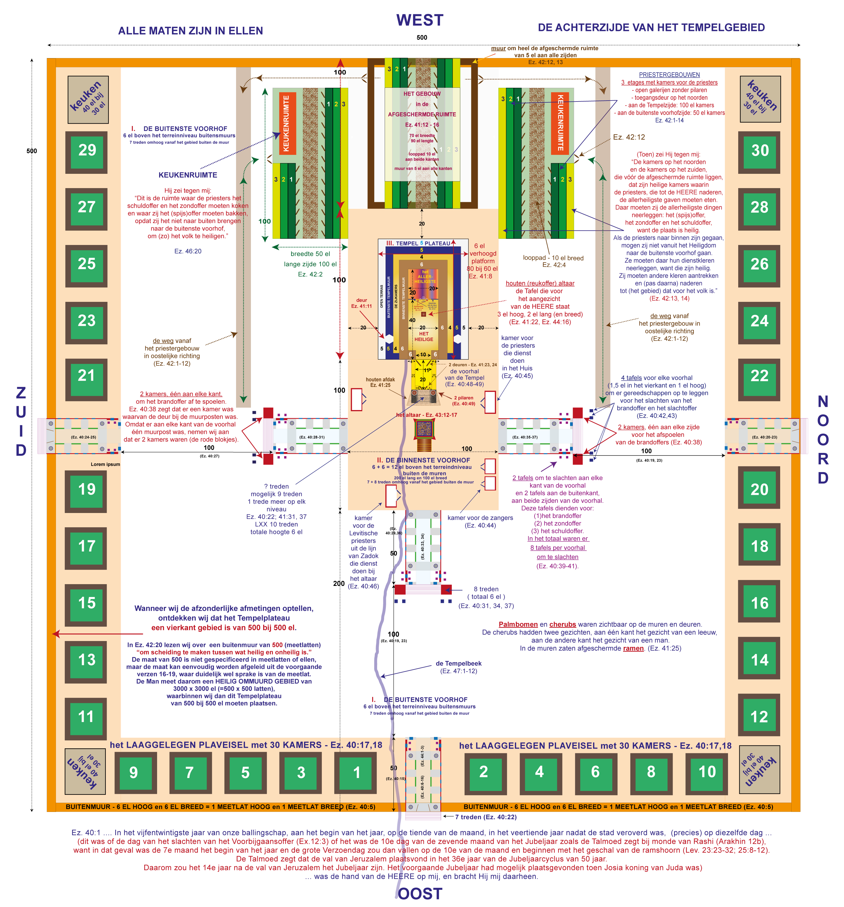 15 Toen hij klaar was met het opmeten van het binnenste van het Huis, bracht hij mij naar buiten door de poort die uitzag op het oosten en hij mat het heilige gebied helemaal in het rond. ◼ ◻ 16 Hij mat de oostzijde met de meetlat: vijfhonderd latten met de meetlat rondom. ◻ 17 Hij mat de noordzijde, vijfhonderd latten met de meetlat rondom. ◻ 18 Hij mat de zuidzijde, vijfhonderd latten met de meetlat.◻ 19 Hij draaide zich om naar de westzijde en mat vijfhonderd latten met de meetlat. ◻ 20 Hij mat het Tempelgebied aan de vier zijden. Er was een muur omheen met een lengte van vijfhonderd meetlatten en een breedte van vijfhonderd meetlatten om scheiding te maken tussen wat heilig en wat onheilig is. ◼ ◻