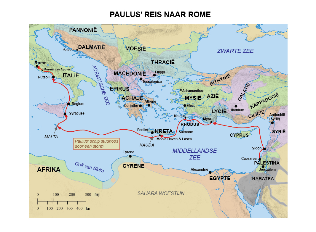 1 Toen besloot Festus om hem naar de keizer in Italië te zenden. Hij droeg Paulus en met hem ook andere gevangenen over aan een hoofdman over honderd van de keizerlijke legerafdeling. Zijn naam was Julius. ◼ ◻ 2 Toen wij zouden afvaren, gingen wij aan boord van een schip uit de stad Adramantos dat richting Asia ging, en Aristarchus, een Macedoniër uit Tessalonika, ging met ons aan boord. ◼ ◻ 3 De volgende dag kwamen wij in Sidon aan. De hoofdman over honderd behandelde Paulus vriendelijk en gaf hem toestemming om zijn vrienden te bezoeken en uit te rusten. ◼ ◻ ◘ 4 Vandaar voeren wij af en, omdat wij de wind tegen hadden, voeren wij met een bocht om Cyprus heen. ◻ 5 Wij staken de zee van Cilicië en Pamfylië over en kwamen in Myra aan, een stad in Lycië. ◼ ◻ 6 Daar vond de hoofdman over honderd een schip uit Alexandrië dat naar Italië zou gaan, en hij liet ons aan boord gaan. ◼ 7 Omdat het schip dagenlang moeizaam vooruitkwam, kwamen wij met veel moeite tegenover het eiland Knidus en, omdat de wind ons niet toeliet om een rechte koers aan te houden, moesten wij met een bocht om het eiland Kreta heen varen ter hoogte van de stad Salmone. ◻ 8 Terwijl wij nauwelijks enige vaart maakten, bereikten wij met een grote boog een plaats die ‘De Mooie Havens’ heette, dicht bij de stad met de naam Lasea. ◻ 9 Daar bleven wij lange tijd, totdat de vastendag van de Joden voorbij was. Omdat het gevaarlijk was om over zee te reizen, waarschuwde Paulus hen ◼ ◻ 10 en zei: “Mannen, ik heb gezien dat onze reis verdrukking en grote schade met zich mee zal brengen, niet alleen wat de lading van ons schip betreft, maar ook wat ons zelf betreft.” ◼ ◻ 11 Maar de hoofdman over honderd luisterde meer naar de stuurman en de kapitein van het schip dan naar de woorden van Paulus. 12 Omdat de haven niet geschikt was om er te overwinteren, wilden de meesten van ons vandaar wegvaren om zo mogelijk een haven op Kreta te bereiken, die Feniks heette en uitkeek op het zuiden, om daar te overwinteren. ◻
